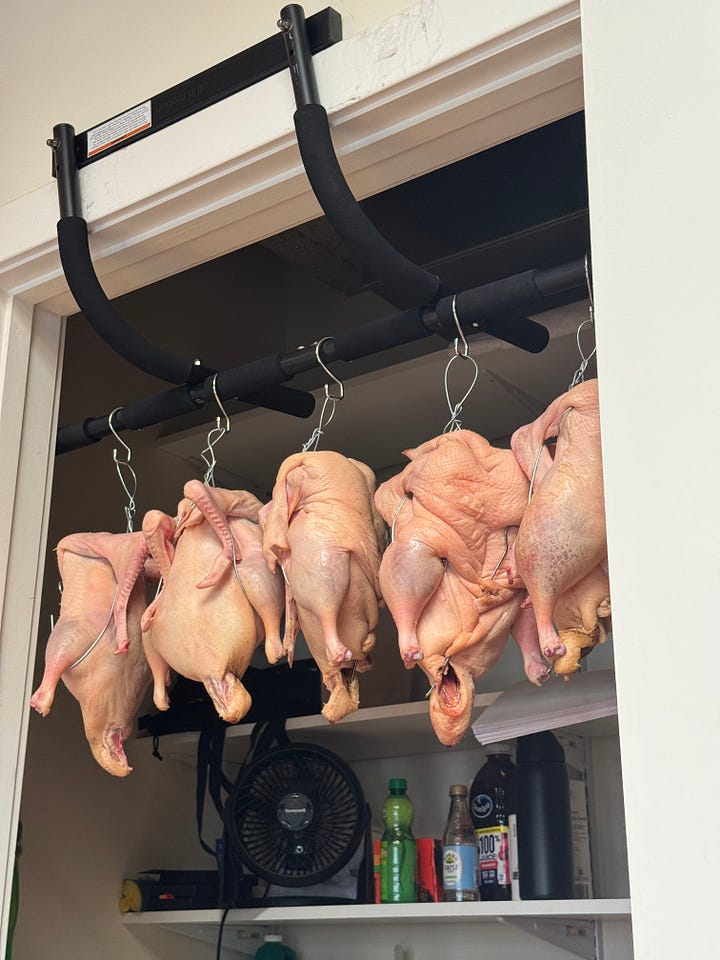 Lacking fridge space to hang all 5 ducks, we settled for fan-drying for an hour and then sticking them uncovered in the fridge overnight.